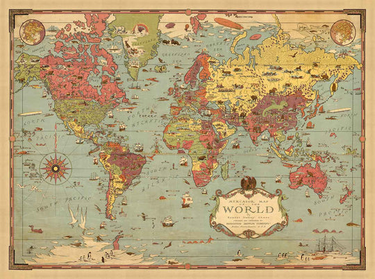 Antiguo mapa Mercator del mundo en 1931 por Ernest Dudley Chase: Monstruos míticos, pirámides, lugares emblemáticos