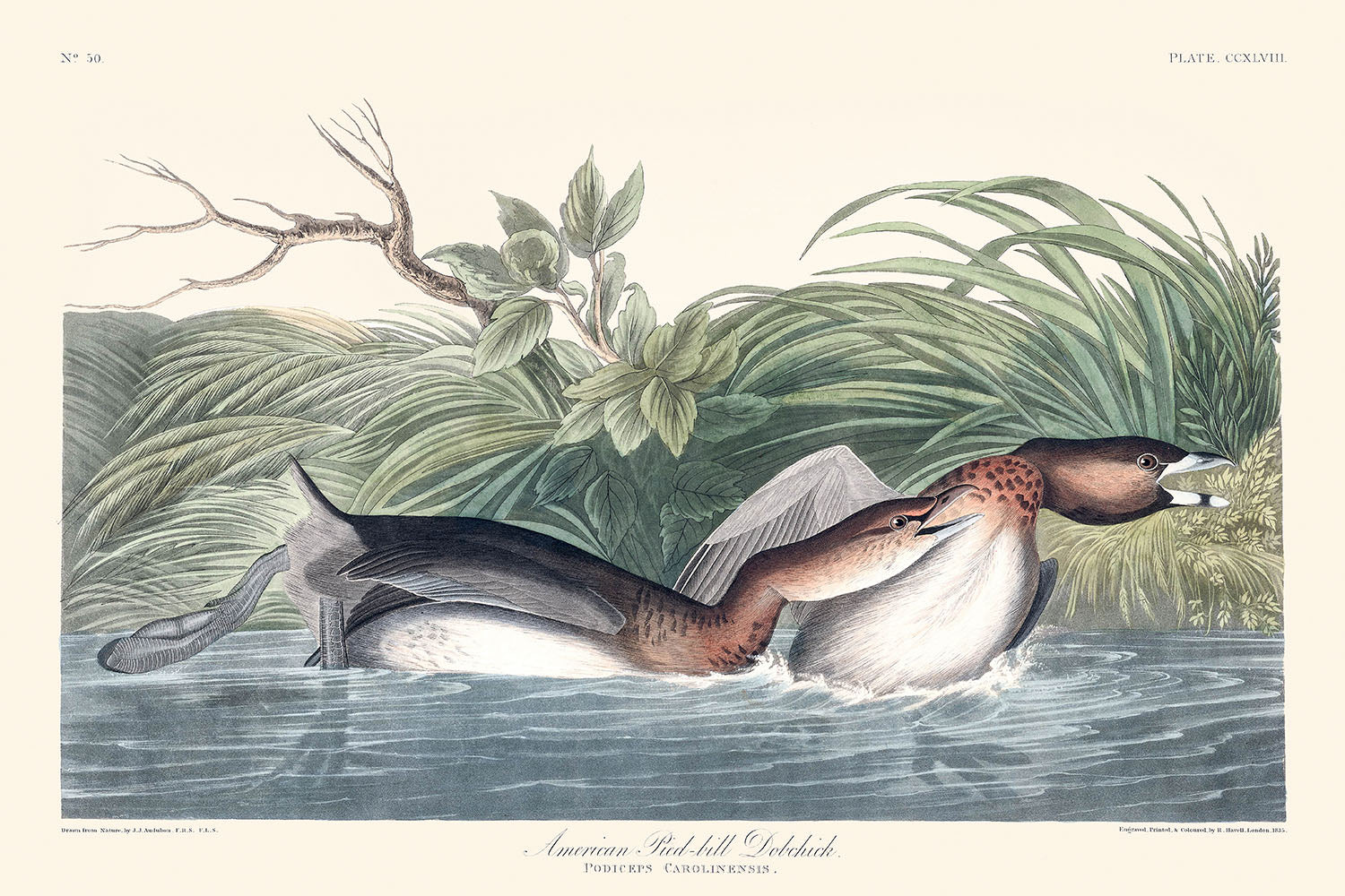 El Zampullín de pico de paloma, o Podilymbus podiceps, está retratado de manera reflexiva en esta ilustración, capturando sus comportamientos únicos y su entorno natural. Con una precisión realista, Audubon muestra a estas "brujas de agua" en su elemento, fusionándose con las hierbas acuáticas, un testimonio tanto de la astucia de la especie como del ojo de Audubon para el realismo. Las sutilezas en el color, desde los tonos apagados del plumaje del zampullín hasta los vibrantes juncos verdes, crean una representación vívida del hábitat del ave.