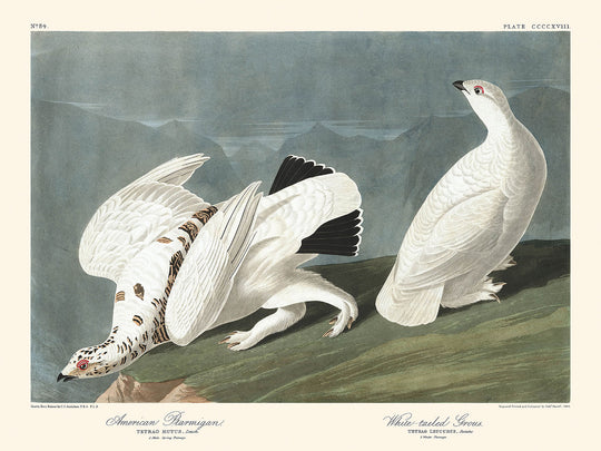 Esta ilustración en particular se destaca no solo por su importancia científica, sino también por su presentación visualmente cautivadora. El uso del color y la composición de Audubon en "Ptarmigan Americano y Grouse de Cola Blanca" da vida a los sujetos, revelando la intrincada belleza de estas especies. Su trabajo ayudó a establecer un alto estándar para futuros artistas de vida silvestre y contribuyó significativamente al conocimiento ornitológico a nivel mundial.