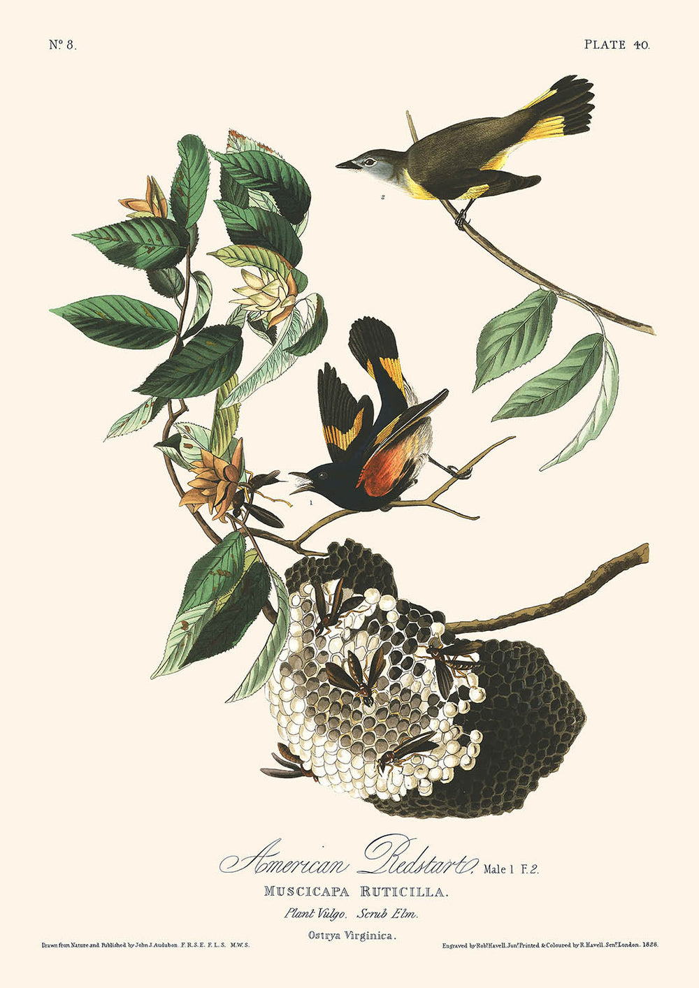 La "American Redstart" de John James Audubon, publicada por primera vez en 1827, es una impresionante ilustración de su obra renombrada, The Birds of America. Esta vibrante pieza captura la esencia enérgica de uno de los atrapamoscas más encantadores de América, el American Redstart.