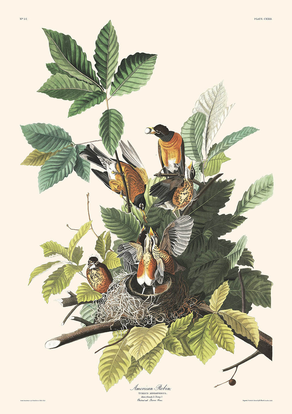 La ilustración del Mirlo Americano se destaca por su vívido detalle y superb composición. El uso de colores por parte de Audubon – desde el rico pecho anaranjado rojizo hasta las delicadas gradaciones en el plumaje gris y marrón – da vida vívidamente al pájaro. Su notable habilidad para capturar la esencia de sus sujetos hace que su trabajo sea atemporal y admirado tanto por naturalistas como por amantes del arte.