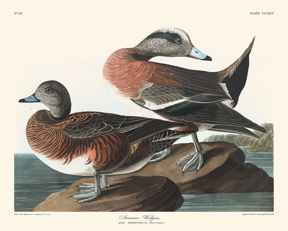 "American Widgeon (Placa 345)," publicado por primera vez en 1827, es una ilustración animada y bellamente detallada de la icónica serie de John James Audubon, The Birds of America. Esta pieza es una cautivadora exploración del American Widgeon, un pato que es muy apreciado por su carne jugosa y diversos hábitats en los Estados Unidos, desde Nueva Orleans hasta el Golfo de México.