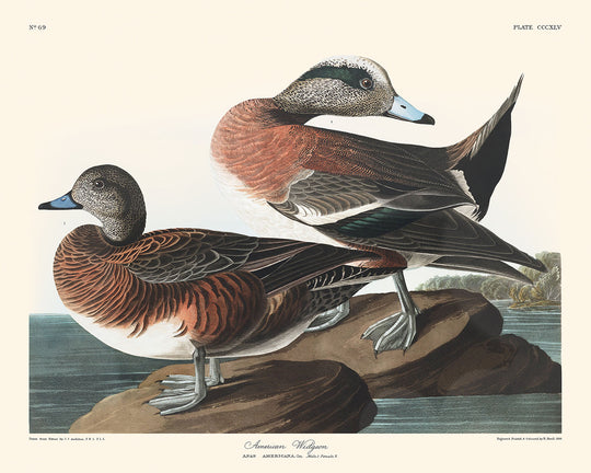 "American Widgeon" se destaca por su vibrante representación de este hermoso pato, con sus patrones ondulantes vívidos y su retrato realista tanto de los machos como de las hembras. El uso de patrones detallados de plumas y la representación a tamaño real realzan la calidad vívida de la obra de arte. Los colores y la posición dinámica de los patos hacen que esta ilustración no solo sea una hazaña artística, sino una pieza crucial para los entusiastas de la historia natural.