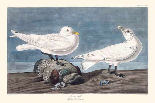 Presentamos "La gaviota de marfil" del reconocido ornitólogo y pintor John James Audubon, publicada por primera vez en 1827 como parte de su obra monumental, Birds of America. Esta exquisita ilustración captura la belleza etérea de la gaviota de marfil, un habitante de las regiones árticas, meticulosamente detallada en el espíritu de la dedicación de Audubon a la historia natural.