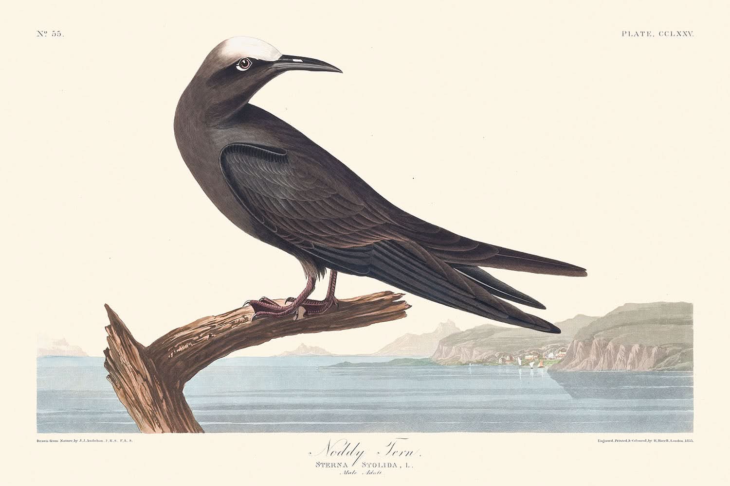 El charrán boquiabierto, conocido científicamente como Sterna stolida, se representa en esta obra de arte en medio del impresionante telón de fondo de los Cayos de Tortugas. Esta ilustración cautiva con su plumaje marrón hollín, sus alas elegantemente alargadas y la postura dinámica del ave, que encapsula tanto la belleza como las complejidades ecológicas observadas por Audubon. El ojo agudo de Audubon para los detalles de la naturaleza se revela en la representación de los comportamientos del charrán boquiabierto, desde las actividades de construcción de nidos hasta sus métodos de alimentación únicos, que se asemejan al patrón de vuelo del gavilán nocturno.