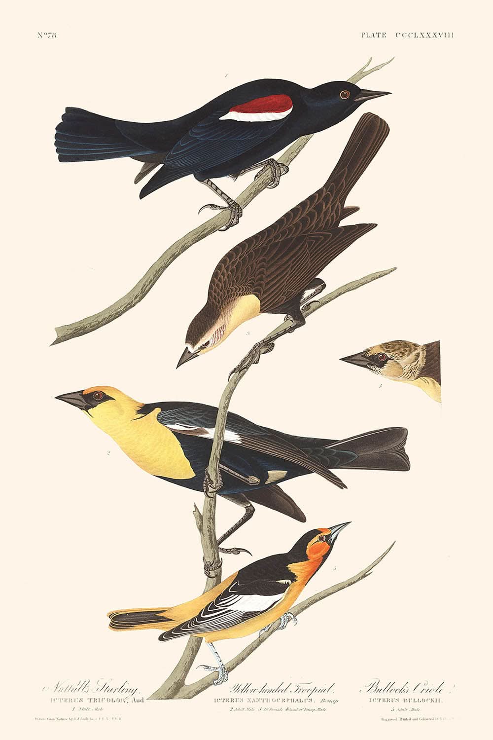 Estornino de Nuttall, troopial de cabeza amarilla, oropéndola de Bullock, de John James Audubon, 1827
