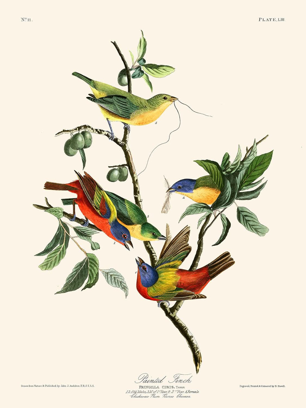 El pinzón pintado (Lámina 53) ejemplifica la magistral atención de Audubon a los detalles y la intrincada belleza del mundo aviar. Su obra se distingue por sus representaciones realistas con pinceladas delicadas que capturan el plumaje vibrante y las formas distintivas de cada especie. La representación colorida del pinzón pintado en su hábitat natural demuestra el talento incomparable de Audubon y su capacidad para acercar al observador a la naturaleza.