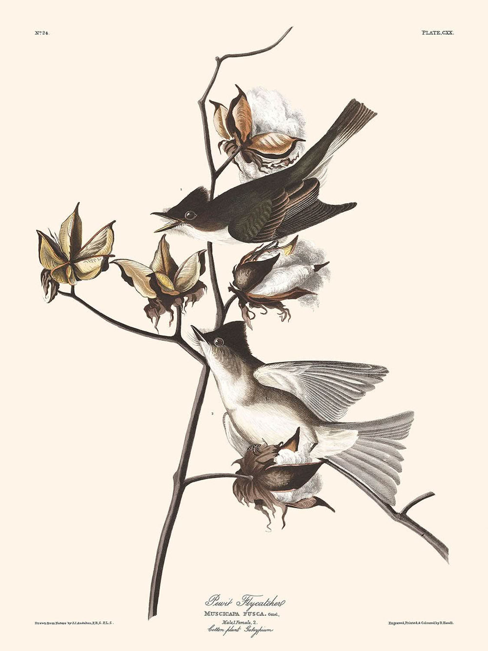 El papamoscas pewit es notable no solo por su interés científico, sino también por la maestría de la representación de Audubon. Audubon capturó detalles minuciosos de los hábitos y la morfología únicos del ave, como la construcción inusual de sus nidos y sus peculiares patrones migratorios. Los colores de esta pieza, con marrones oliváceos oscuros contrastados por tonos más claros, crean una imagen rica y texturizada que es atractiva y educativa tanto para los entusiastas del arte como para los naturalistas.