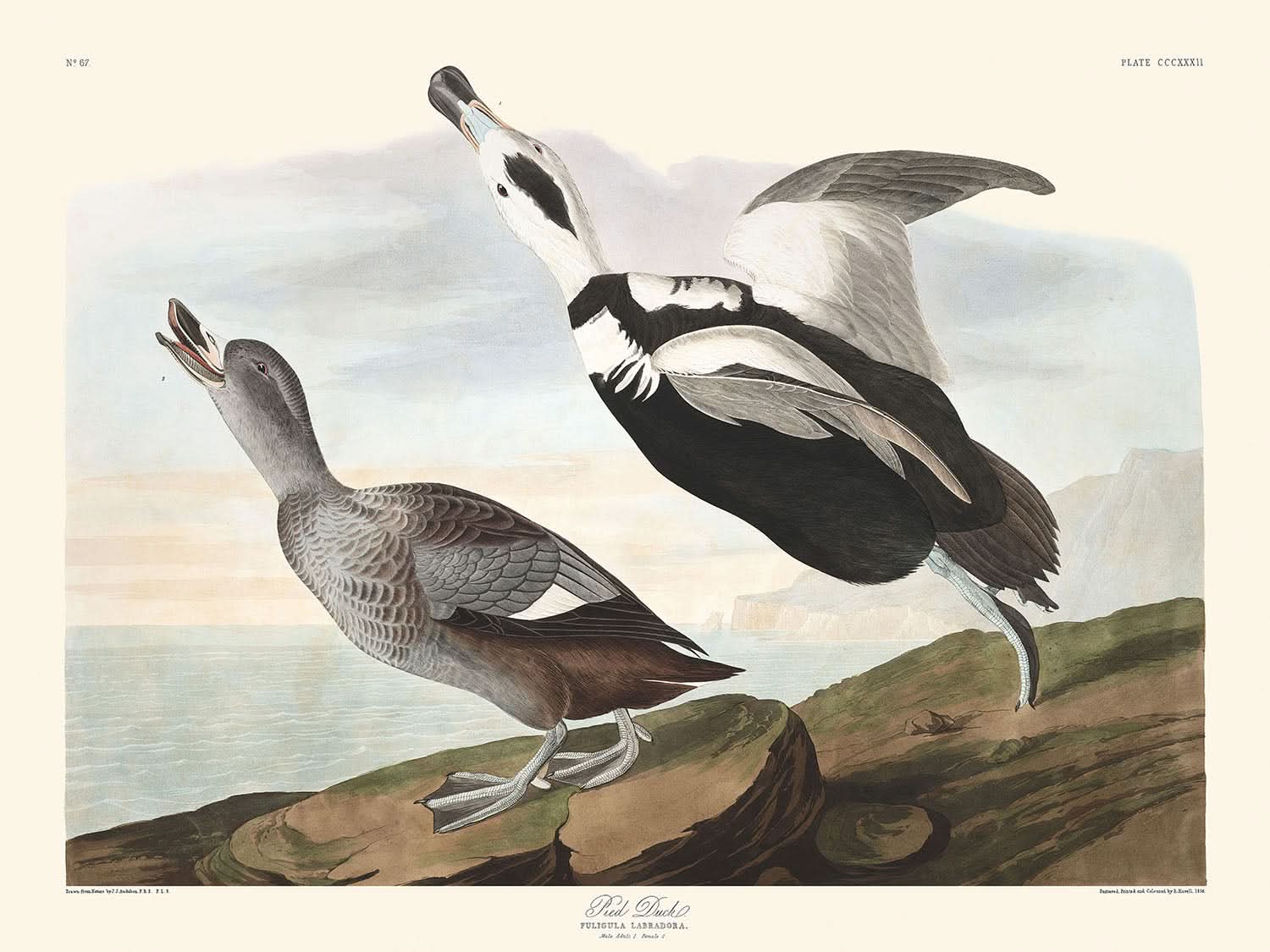 Audubon, reconocido por su enfoque revolucionario de la ornitología y el arte, hizo de "Birds of America" una obra maestra sin igual que consta de 435 impresiones de tamaño natural coloreadas a mano. La atención a la precisión anatómica y la representación vivaz de los hábitats nativos distinguen el trabajo de Audubon, incluido "Pied Duck", que muestra su talento interpretativo y su dedicación a la precisión aviar. Con una representación realista de las plumas y los fondos atmosféricos, su trabajo no solo captura el espíritu sino también la esencia de cada especie.