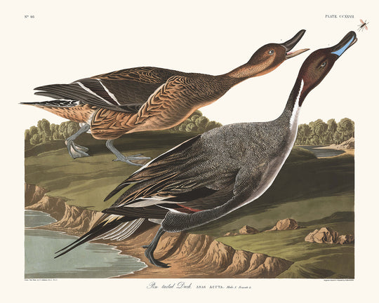 "Pato de cola de alfiler, macho y hembra", publicado por primera vez en 1827, es una exquisita obra de arte ornitológica de John James Audubon, parte de su monumental serie, "Los pájaros de América". Esta obra de arte captura los detalles intrincados y la belleza natural del pato rabudo macho y hembra, en contraste con su hábitat natural.