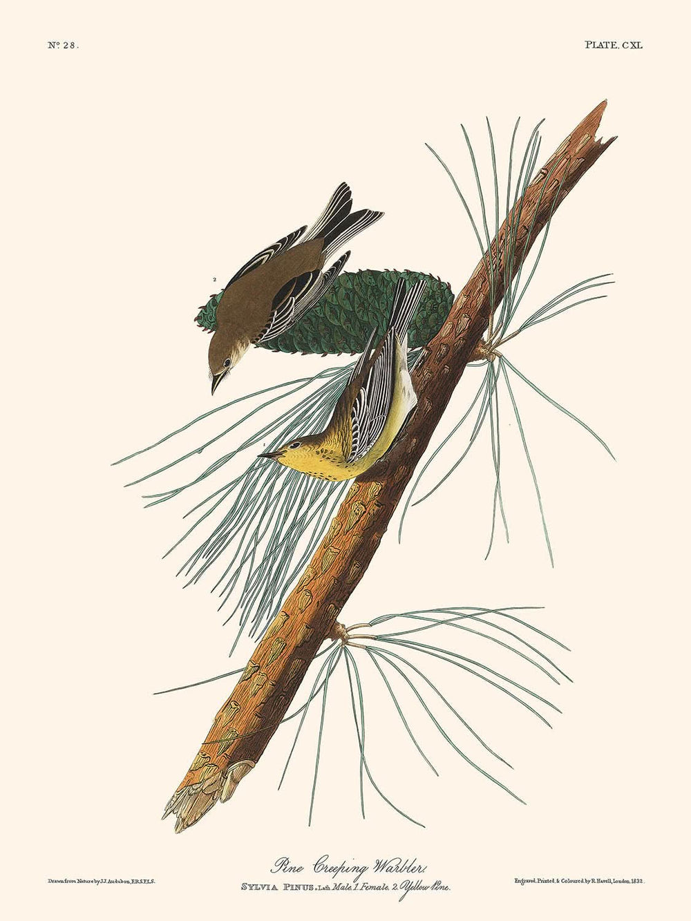 El "Pájaro Cernícalo de Pino (Sylvia pinus)" es una de las muchas especies espléndidas documentadas por Audubon. Esta ilustración en particular captura al cernícalo con notable atención, representando su preferencia por los pinos y su plumaje vibrante, que cambia con las estaciones. Su representación en una rama de su pino favorito, incluso en los menos vibrantes tonos invernales, enfatiza la dedicación de Audubon al realismo y sus agudas habilidades de observación.