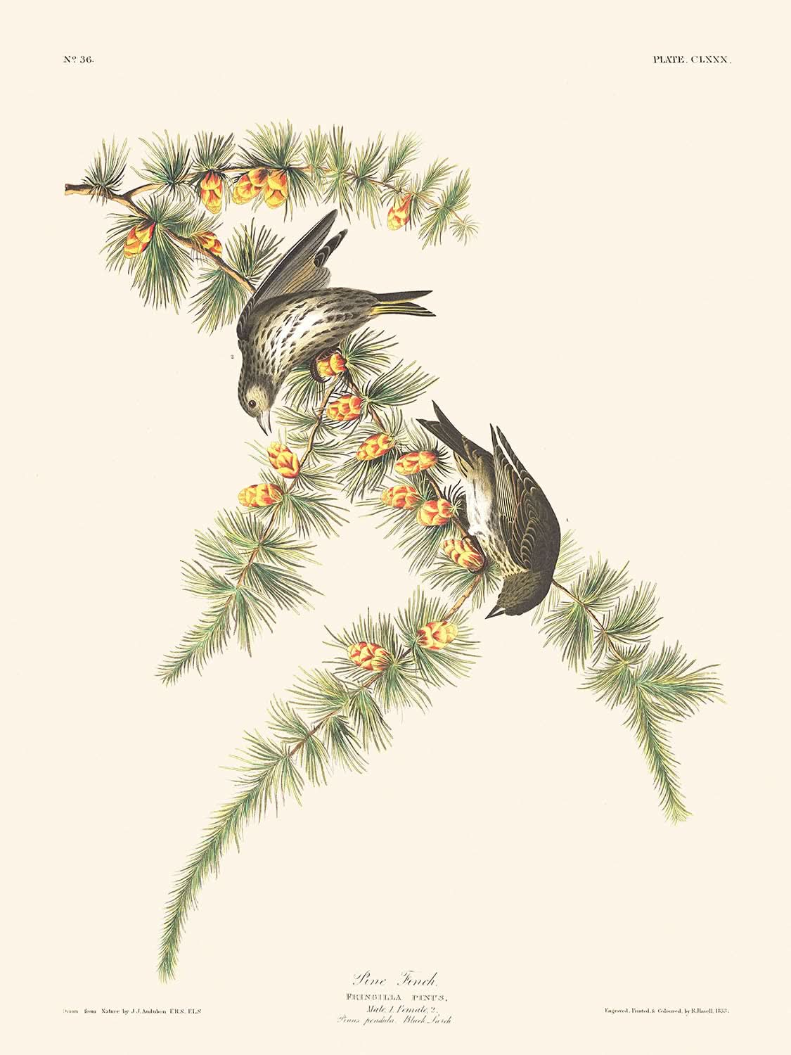 "Pine Finch" de John James Audubon, publicada por primera vez en 1827, es una ilustración cautivadora de su preciada colección "Birds of America". Esta obra de arte en particular captura de manera hermosa al vivaz pinzón de pino durante sus intrincadas migraciones estacionales a través de una variedad de paisajes de América del Norte.