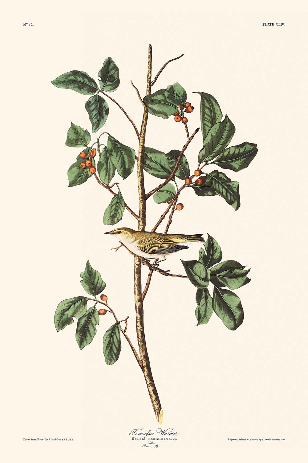 La impresión del Tennessee Warbler destaca tonos vibrantes: el verde oliva domina el plumaje con sutiles matices de crema y blanco, acentuado por plumas marrón oscuro y marcas amarillas pálidas sobre el ojo, capturando la esencia del pájaro con vívida precisión. Los delicados detalles en la pose y el entorno del pájaro con las plantas de Ilex laxiflora realzan el dinamismo y el movimiento típicamente no vistos en impresiones estáticas. Este realismo invita al espectador al mundo de descubrimiento y belleza intrincada de Audubon.