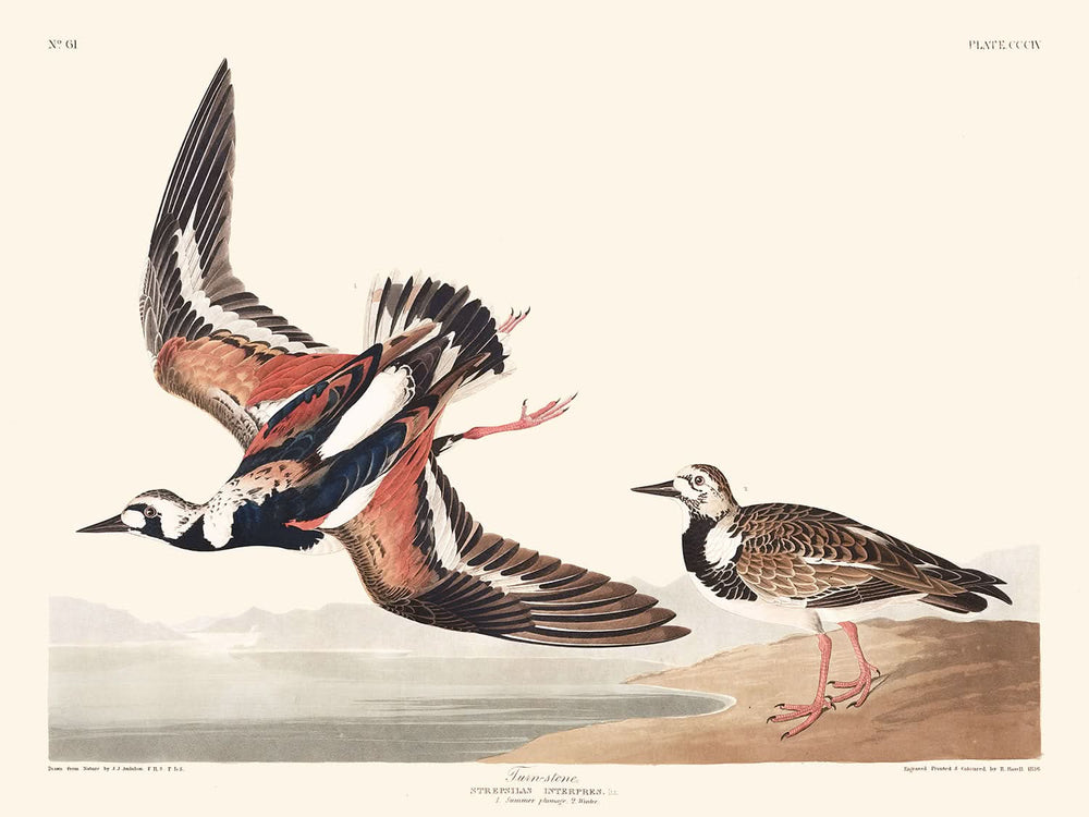 El vuelvepiedras, obra del eminente ornitólogo y artista John James Audubon, apareció por primera vez en 1827 en la ilustre colección de "Aves de América". Esta exquisita ilustración de aves captura la esencia de la dedicación de Audubon a su arte, mostrando la esquiva belleza y los intrincados detalles del vuelvepiedras en su hábitat natural.