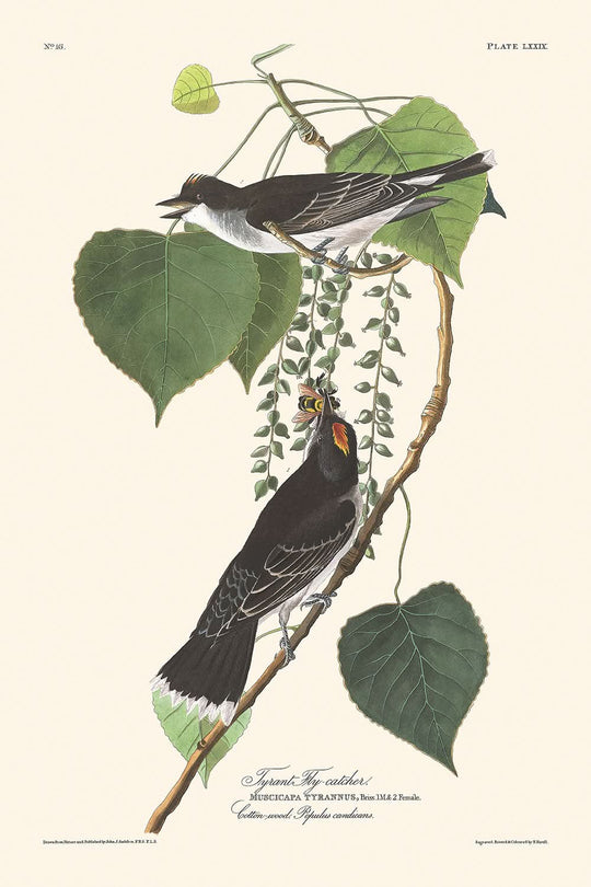 El "Tyrant Fly-catcher" de John James Audubon, de su legendaria serie "Birds of America", publicada inicialmente en 1827, captura la esencia majestuosa de esta ave única. Conocido por su agudo y trémulo grito y sus dinámicos patrones de vuelo, el Tyrant Fly-catcher, también llamado Tyrant Bird o Field Martin, está retratado en medio de su hábitat natural en la detallada ilustración de Audubon.