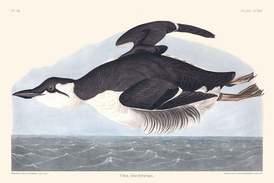 Uria Brunnichi, exquisitamente ilustrada por John James Audubon en 1827, tiene una presencia significativa en la famosa colección de Audubon, Birds of America. Esta ilustración captura las características distintivas del arao de Brunnich, un ave que se encuentra a menudo en las bahías heladas del Atlántico norte.