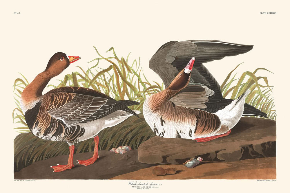 El ganso de frente blanca, ilustrado por el renombrado ornitólogo John James Audubon en 1827, forma parte de la preciada colección de The Birds of America, una obra conocida por sus impresionantes representaciones en tamaño natural de varias especies de aves. Los esfuerzos artísticos de Audubon capturaron tanto los intrincados detalles como la majestuosidad de la vida aviar, que se reflejan aquí en su representación del ganso de frente blanca.