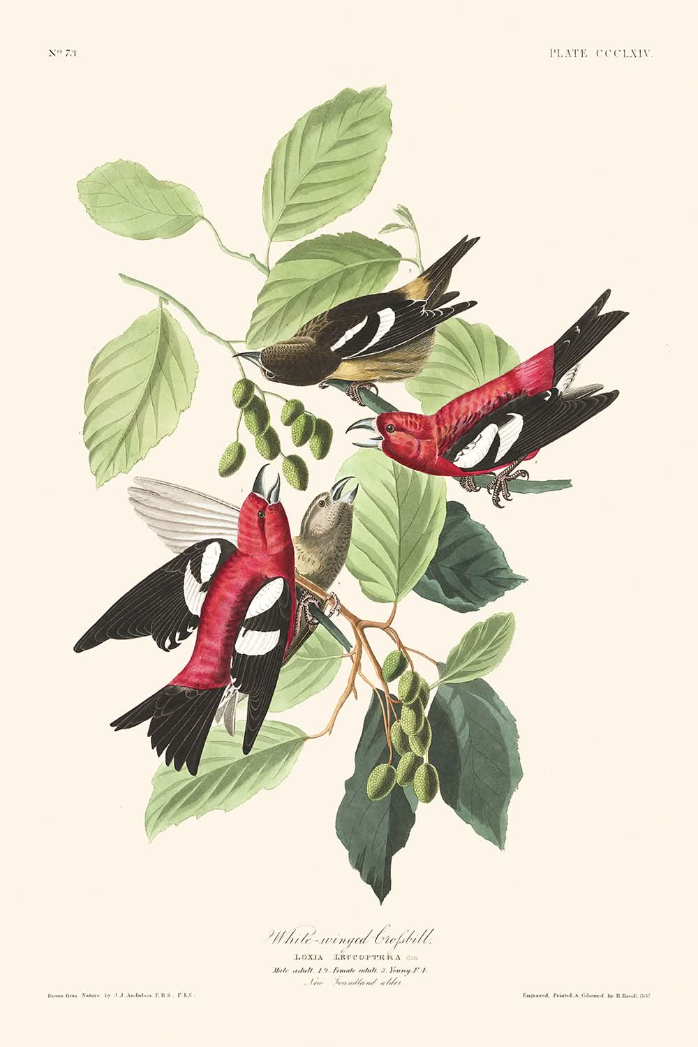 La ilustración del "Piquituerto de alas blancas" es particularmente notable por su rico uso de tonos carmesí y carmesí, junto con llamativos contrastes en sus patrones de alas en blanco y negro. La representación de su aislado hábitat del norte brinda una sensación de serenidad y aventura. Al retratar a las aves en medio de la agreste belleza de la naturaleza salvaje del norte, Audubon invita a los espectadores a apreciar el intrincado equilibrio de la naturaleza y la resiliencia de estas criaturas migratorias.