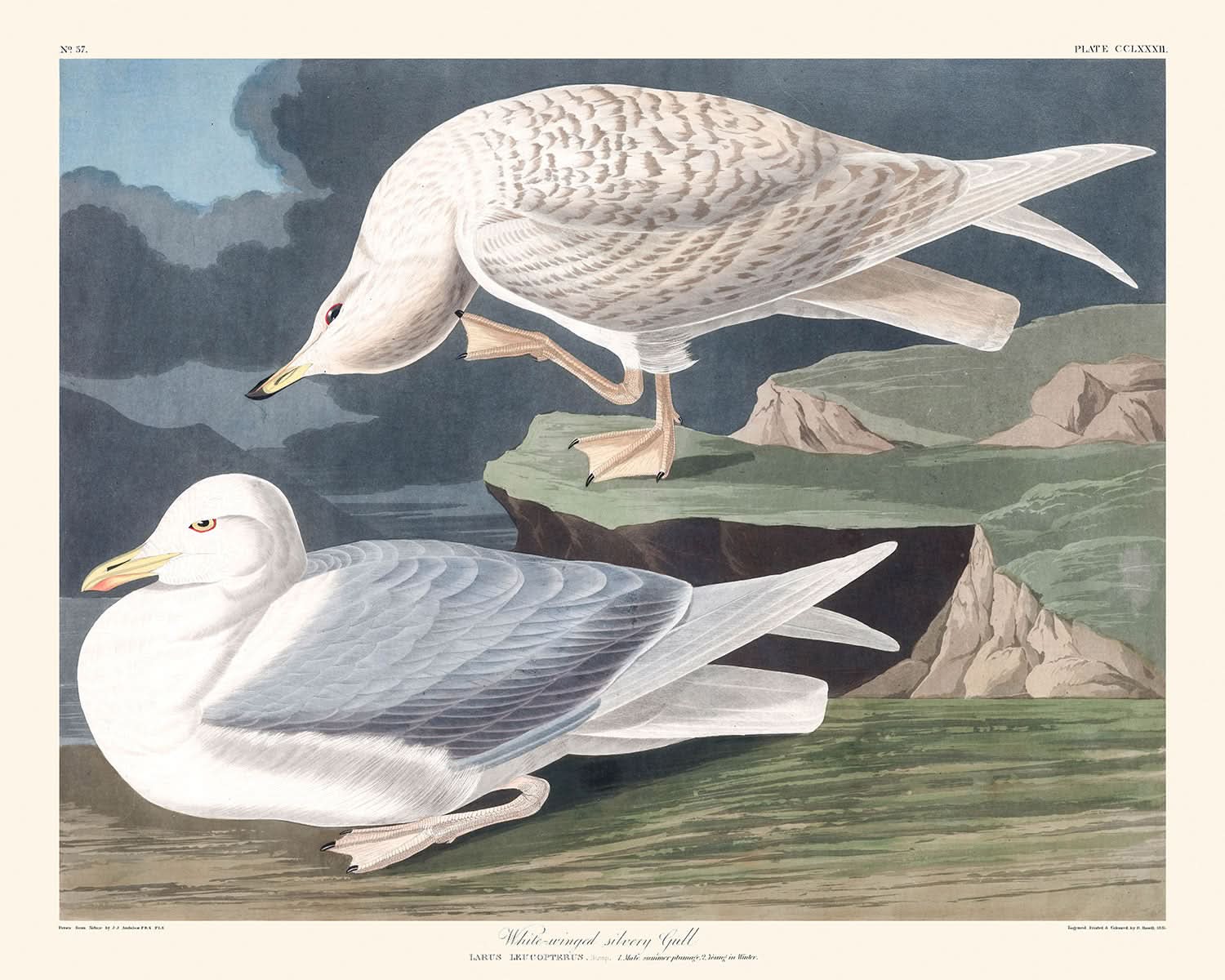 Esta ilustración específica es notable por su representación de la gaviota plateada de alas blancas, o Larus leucopterus, una especie observada durante el invierno que se extiende desde Nueva York hasta Nueva Escocia. La cuidadosa observación de Audubon le permitió capturar perfectamente las llamativas alas blancas del ave en contraste con la paleta más amplia de su entorno, enfatizando una suavidad y elasticidad únicas de esta gaviota.