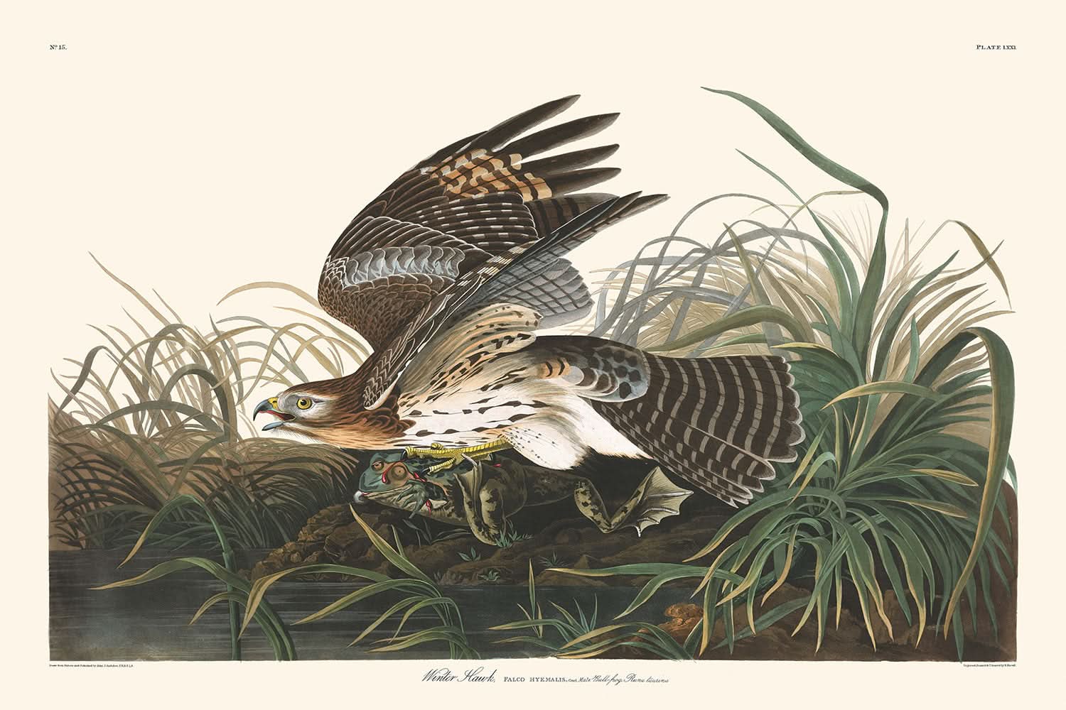 El halcón invernal, publicado por primera vez en 1827, es una ilustración cautivadora de la famosa colección Birds of America de John James Audubon. Esta pieza captura de manera hermosa la presencia majestuosa del halcón invernal con asombrosos detalles.