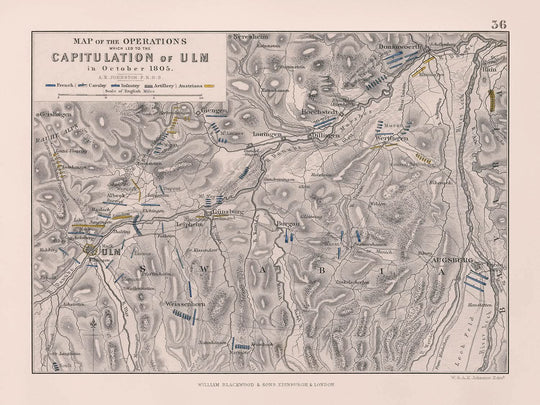 El "Mapa de las operaciones que llevaron a la Capitulación de Ulm en octubre de 1805" del renombrado geógrafo AK Johnston es más que una representación de maniobras militares históricas; es un testimonio del arte cartográfico de principios del siglo XIX. Esta exquisita litografía a mano, creada en 1805, describe hábilmente las posiciones clave de las fuerzas francesas y austriacas durante una de las batallas decisivas de las Guerras Napoleónicas. Cada unidad—caballería, infantería y artillería—está meticulosamente capturada, proporcionando una vívida instantánea de la historia a través de la planificación estratégica y el genio topográfico.
