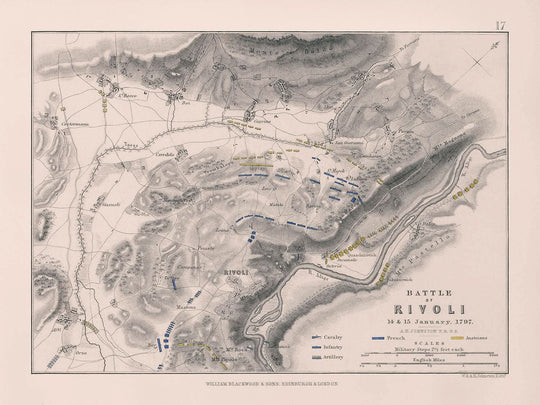 Presentamos la extraordinaria "Batalla de Rivoli, 14 y 15 de enero de 1797" de AK Johnston, una impresionante litografía antigua en color que traza la intrincada coreografía de uno de los enfrentamientos militares más notables de la historia. Creado en 1797, este plan de batalla proporciona una representación vívida de las posiciones estratégicas y los movimientos de las fuerzas francesas y austriacas, ilustradas a través de una serie de unidades de caballería, infantería y artillería. Con detalles del terreno representados mediante sombreados, esta obra de arte ofrece una representación meticulosa del paisaje del campo de batalla.