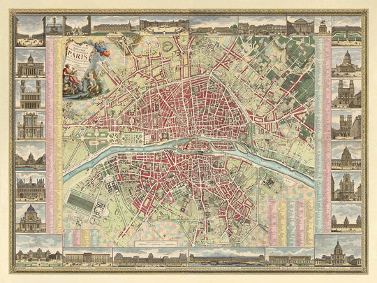 - Estilo de diseño: Borde floral; cartela del título que muestra ángeles y una alegoría de París con los símbolos de las artes y las ciencias; 28 ilustraciones insertadas de lugares y puntos de referencia.