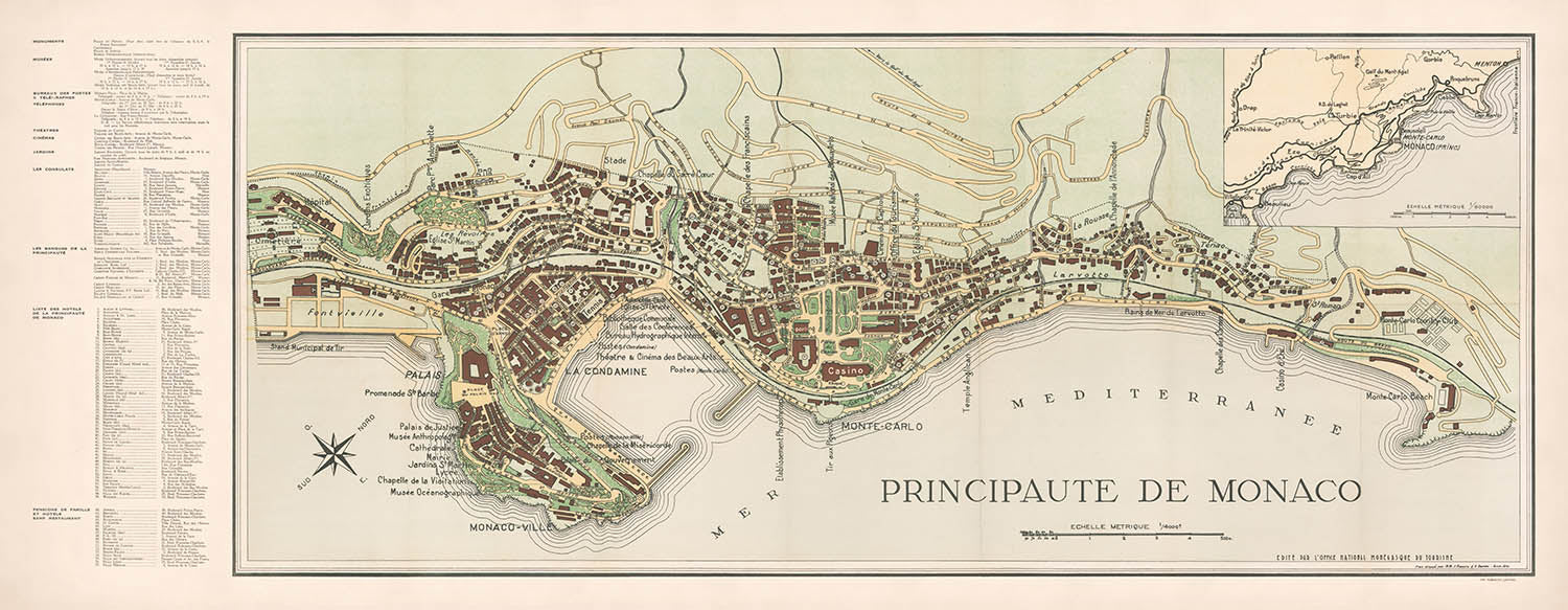 El mapa de la "Principauté de Mónaco", elaborado por J. Fissore y V. Danoy en 1943, ofrece una fascinante visión del intrincado paisaje urbano de Mónaco durante un momento crucial en la historia. Este detallado mapa de calles de la ciudad, publicado por la Oficina Nacional de Turismo de Mónaco, muestra el encanto y la elegancia únicos del principado. A medida que exploras el mapa, descubrirás los vibrantes barrios de Monte-Carlo, La Condamine, Mónaco-Ville y Larvotto, cada uno con su carácter y atractivo distintivos. Estas áreas no son solo ubicaciones geográficas, sino distritos históricos que han sido escenario de innumerables eventos históricos y hitos culturales.