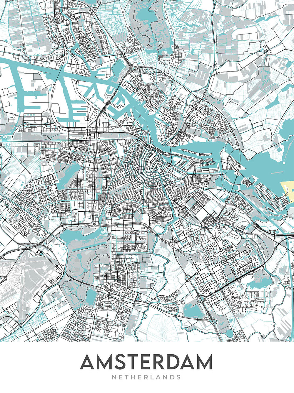 Este mapa de Ámsterdam es un callejero moderno y detallado que se centra en los barrios y puntos de referencia únicos de la ciudad. El mapa cubre una gran área de la ciudad, incluido el centro de la ciudad, los vecindarios circundantes y algunos de los suburbios. El mapa está diseñado para ser informativo y visualmente atractivo, lo que lo convierte en una excelente adición a cualquier hogar u oficina.