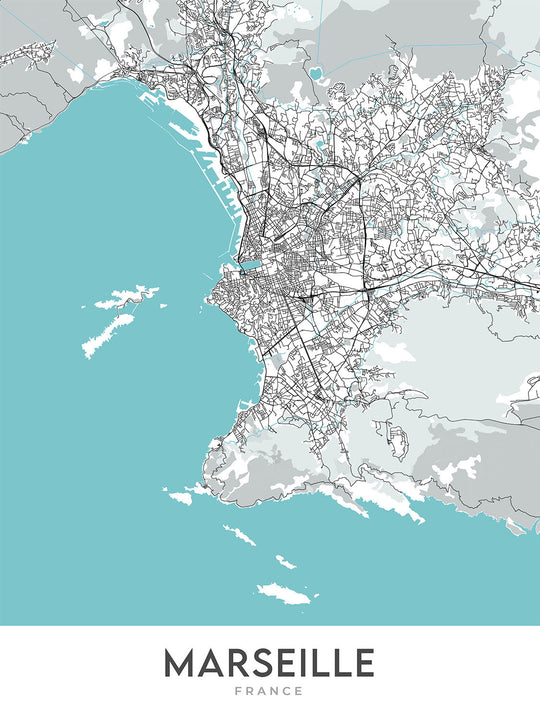 Este mapa de Marsella es una obra de arte cartográfica moderna y detallada que se centra en el paisaje urbano de esta vibrante ciudad del sur de Francia. El mapa cubre una parte importante de Marsella, incluido el centro de la ciudad y los barrios circundantes, y ofrece una visión completa del diseño de la ciudad y sus lugares más emblemáticos.