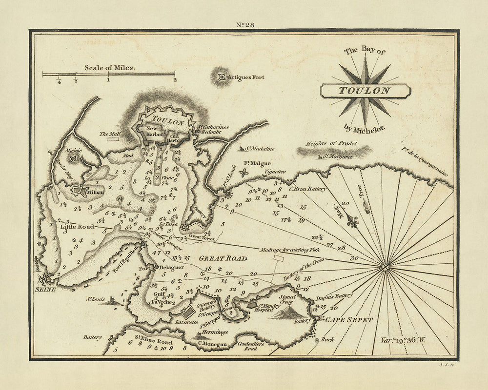 Los sondeos detallados y las anotaciones de los bancos de arena y otros peligros para la navegación que aparecen en la carta reflejan los desafíos que enfrentan los navegantes que navegan por la Bahía de Toulon. Estos elementos no sólo aumentan el valor histórico de la carta, sino que también resaltan los avances en la topografía y cartografía marítima de la época. La capacidad de Heather para transmitir información marítima compleja de una manera comprensible y visualmente atractiva es un testimonio de su experiencia y enfoque innovador en la elaboración de cartas.
