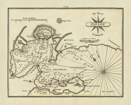 El mapa "La Bahía de Toulon" es una clase magistral de cartografía naval, que muestra no sólo la bahía en sí, sino también la intrincada red de accidentes topográficos, sondeos y fondeaderos. El meticuloso detalle con el que Heather ha trazado las profundidades y los peligros de las aguas hace de esta pieza un recurso invaluable para comprender la logística naval del siglo XVIII. Además, la inclusión de las fortificaciones de Toulon, junto con otras estructuras, permite vislumbrar las estrategias defensivas empleadas en una de las bases navales más importantes de Francia.