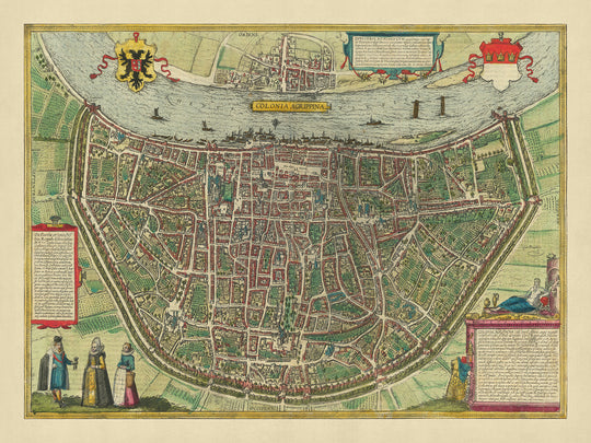 El "Colonia Agrippina" de Braun es una maravilla del diseño cartográfico, empleando un estilo realista que da vida a la vasta extensión de la ciudad y sus características definitorias. La vista aérea del mapa no solo muestra la grandeza arquitectónica de monumentos como la Catedral de Colonia y el ayuntamiento, sino que también proporciona un vistazo a la vida diaria de sus habitantes a través de la detallada representación de calles y edificios. Los elaborados bordes y cartuchos del mapa, adornados con narrativas históricas y geográficas, realzan su atractivo estético, convirtiéndolo en una pieza codiciada para coleccionistas y entusiastas de los mapas históricos.
