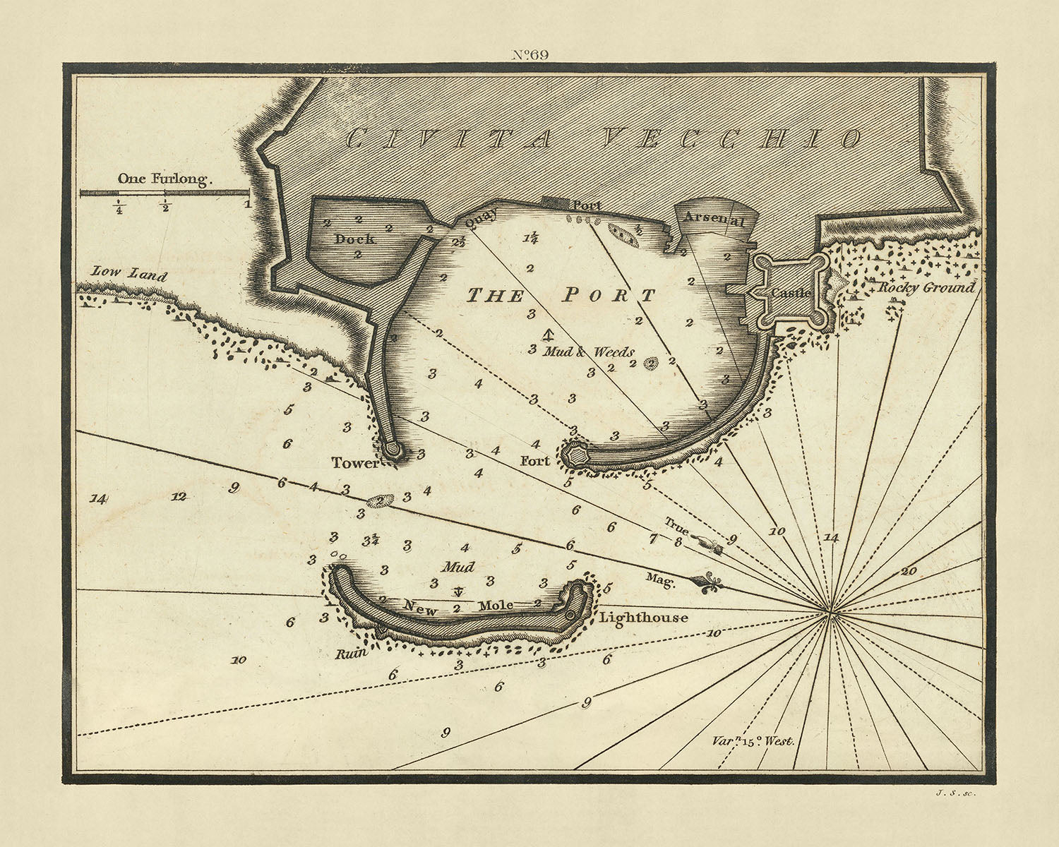 Vieja Civitavecchia, Italia Carta Náutica por Heather, 1802: Puerto, Castillo, Faro