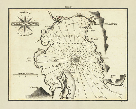 El enfoque principal del mapa es el Golfo de Alexandretta, ahora conocido como el Golfo de Iskenderun, ubicado en el noreste del Mar Mediterráneo. Esta área es estratégicamente significativa, limitada al norte por Turquía y al sur por Siria, con ciudades clave como Alexandretta (Iskenderun) y Antioquía (Antakya). La carta está meticulosamente orientada con el este en la parte superior, una convención no comúnmente vista en la cartografía moderna. Incluye sondeos detallados, anclajes y matices topográficos que eran esenciales para una navegación y anclaje seguros, reflejando el compromiso de Heather con la precisión y utilidad en sus cartas náuticas.