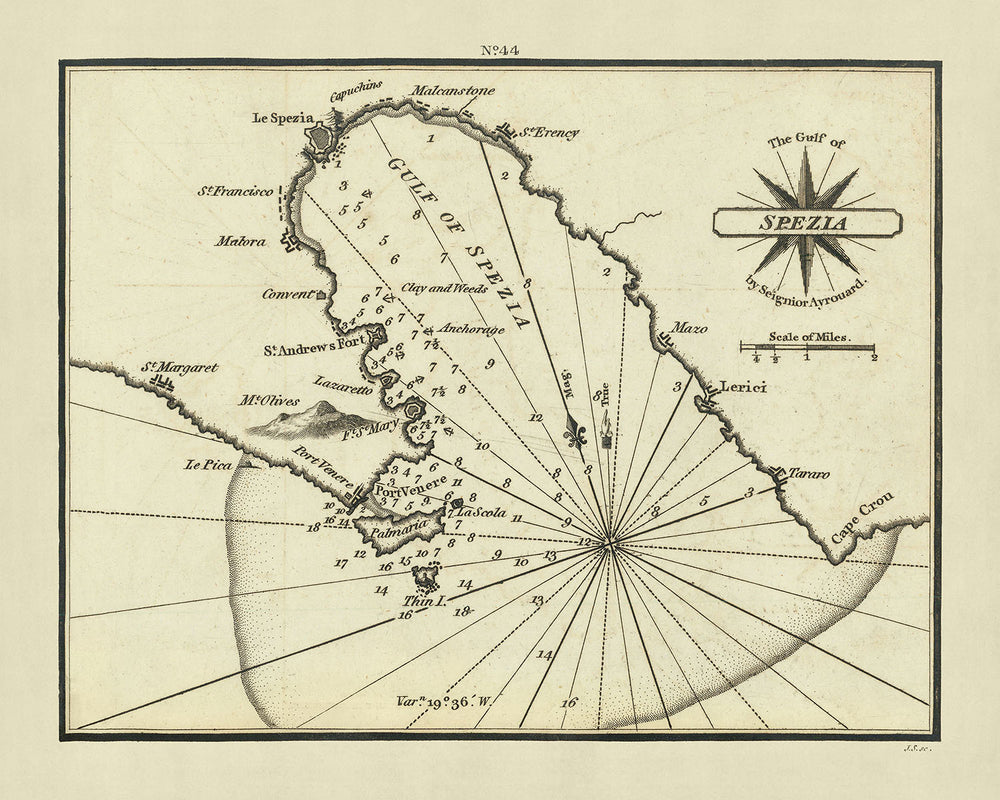 Esta carta detalla el Golfo de Spezia, una zona famosa por su impresionante paisaje costero y su importancia marítima estratégica. El mapa está finamente comentado con sondeos, características topográficas y diversos detalles náuticos, como fondeaderos y fuertes. Muestra lugares clave como Porto Venere, Lerici y La Spezia, ciudades pintorescas y de importancia histórica que sirven como puerta de entrada a las famosas Cinque Terre. La inclusión de estos detalles no sólo ayuda a la navegación sino que también permite vislumbrar la infraestructura marítima de la época.