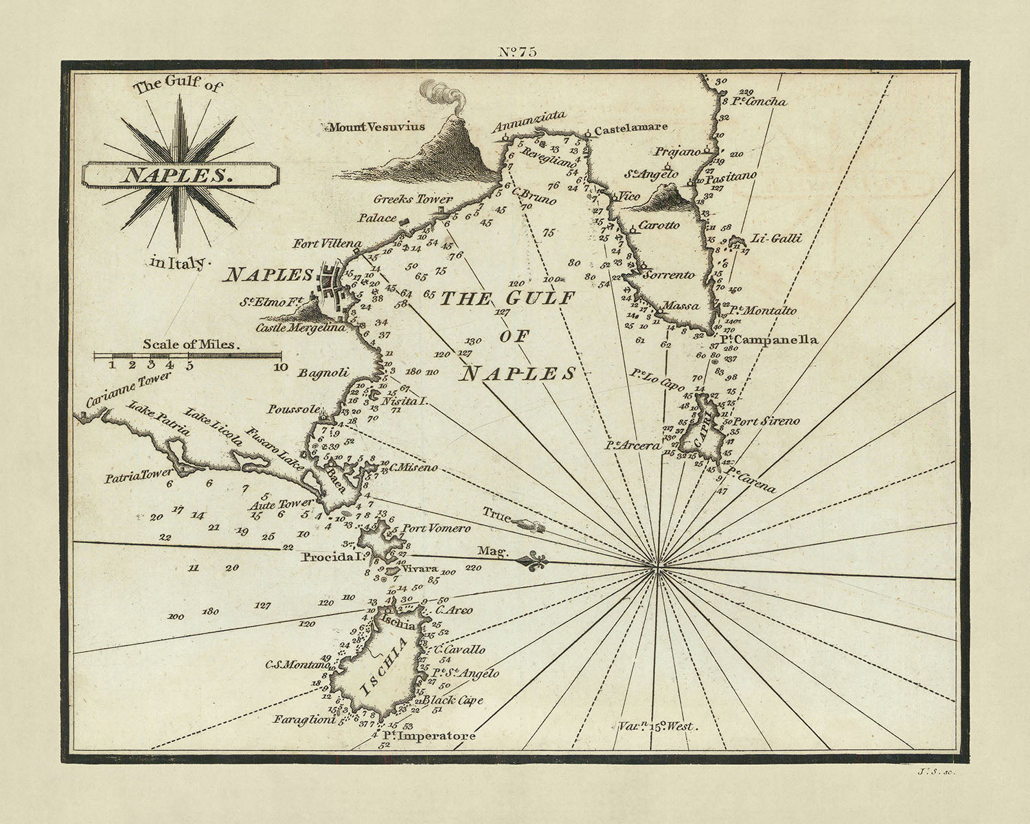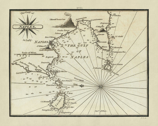 Más allá de su utilidad para los marineros de su tiempo, el mapa sirve como una instantánea histórica, capturando los intrincados detalles de la vida costera e insular. Incluye la bulliciosa ciudad de Nápoles, las serenas islas de Capri e Ischia, y los pintorescos pueblos que salpican la Península de Sorrento. Notables son las representaciones de sitios antiguos y medievales, como las ruinas de Pompeya y el Castel dell'Ovo, ofreciendo un vistazo al rico pasado de la región. La inclusión de una barra de escala y una rosa de los vientos aumenta aún más su valor, proporcionando información sobre el uso práctico del mapa durante la era de Heather.