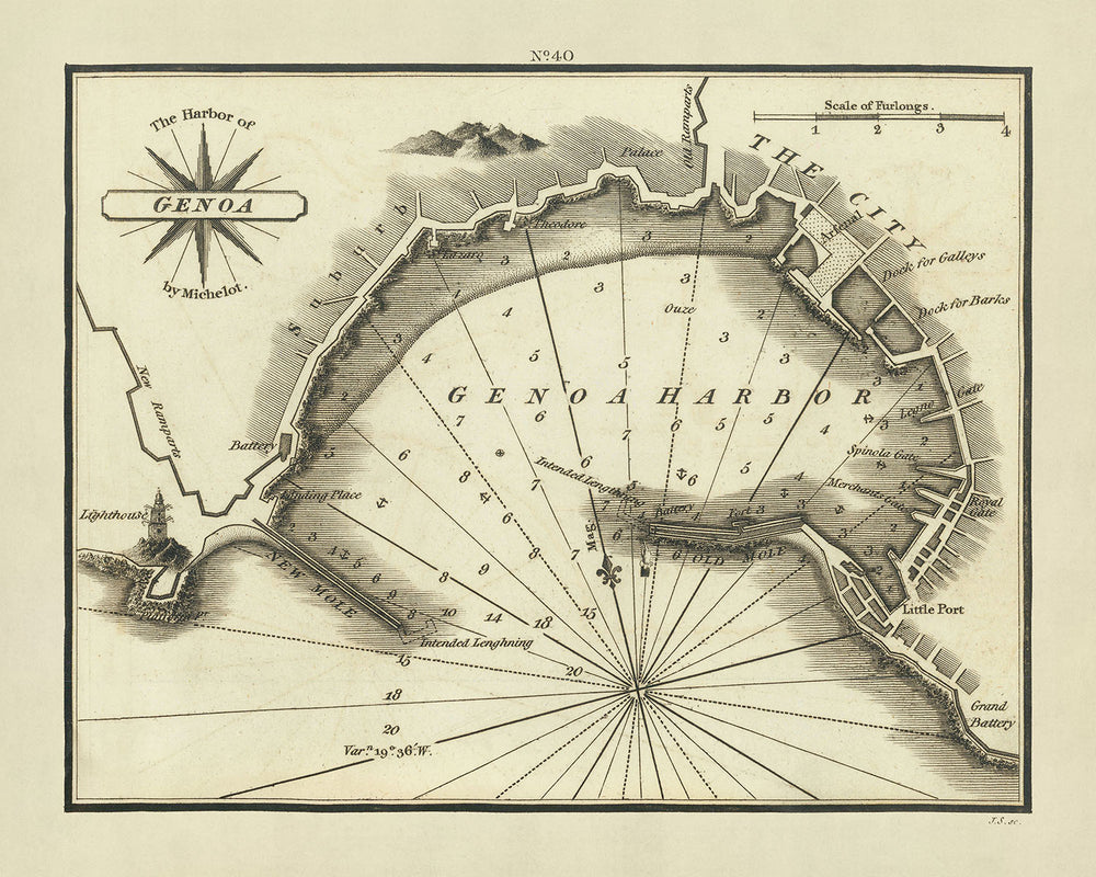 Puerto Viejo de Génova, Italia Carta Náutica por Heather, 1802: Lanterna, Fortificaciones, Palacio