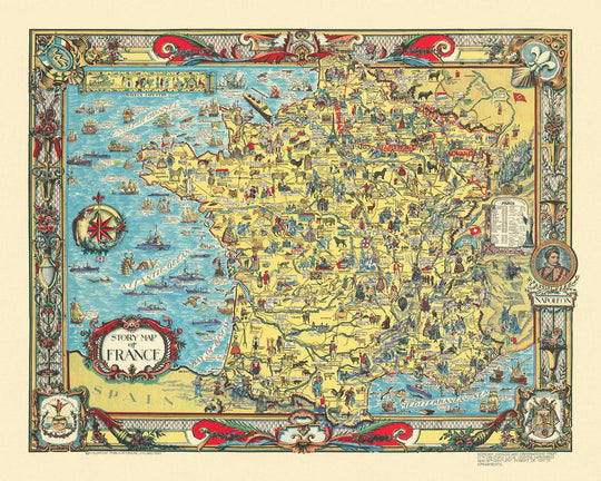 El mapa captura a la perfección la esencia de Francia, destacando sus principales ciudades, como París, Marsella y Lyon. Cada ciudad está representada con un detalle meticuloso, lo que refleja su importancia histórica y cultural. París, el corazón de Francia, ocupa un lugar destacado, lo que simboliza su condición de centro mundial del arte, la moda y la filosofía. Las ilustraciones del mapa dan vida a estas ciudades y ofrecen una visión de los vibrantes paisajes urbanos de la década de 1930.