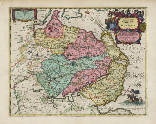Mapa antiguo de Anglia y Schwansen por Joan Blaeu, 1665: Flensburg, Schleswig, Glücksburg, Kappeln, Süderbrarup, Mar Báltico, Fiordos