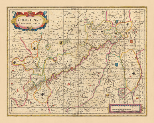 Más allá de su atractivo estético, la 'Coloniensis Archiepiscopatus' sirve como una ventana al pasado. Ofrece una visión del panorama político y geográfico de la época, revelando cómo ha evolucionado la región a lo largo de los siglos. Si es un entusiasta de la historia, un amante de los mapas o simplemente alguien que aprecia las bellas artes, este mapa seguramente cautivará su interés.