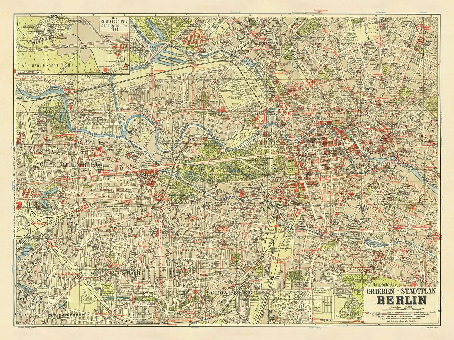 Antigua mapa de Berlín por Stilke, 1936: Olimpiadas, Grunewald, Tiergarten, Kurfürstendamm, Unter den Linden