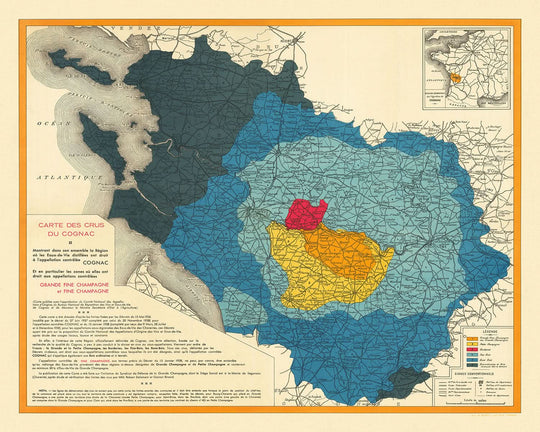 Este mapa es de gran importancia histórica, ya que captura una instantánea de la región de Cognac en una época en la que la industria del vino estaba ganando prominencia internacional. El sistema de clasificación detallado del mapa refleja los estándares y tradiciones meticulosos que desde hace mucho tiempo se asocian con la producción de Cognac. Para los coleccionistas y entusiastas, este mapa no es solo una obra de arte, sino también un valioso documento histórico que ofrece información sobre la evolución de una de las exportaciones más preciadas de Francia.