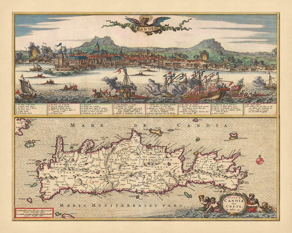 Lo que distingue a este mapa es la vista detallada en la parte inferior, que ilustra el asedio turco de Candia. Una llave, cuidadosamente colocada en la parte inferior, ayuda a localizar 33 puntos de interés, lo que permite al espectador profundizar en el contexto histórico de la región. Desde ciudades y pueblos hasta vías navegables y canales, todos los aspectos del paisaje están representados, proporcionando una visión general completa de Creta durante este período.