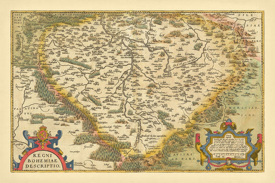 La "Regni Bohemiae Descriptio" es un testimonio de la habilidad y visión de Ortelius como cartógrafo. Sirve como una ventana al pasado, ofreciendo a los espectadores modernos la oportunidad de explorar el rico tapiz de la geografía e historia de Bohemia. La combinación de cartografía detallada y embellecimiento artístico del mapa lo convierte en una pieza preciada para coleccionistas e historiadores por igual, encarnando el espíritu de descubrimiento y la búsqueda de conocimiento que definió la era del Renacimiento.