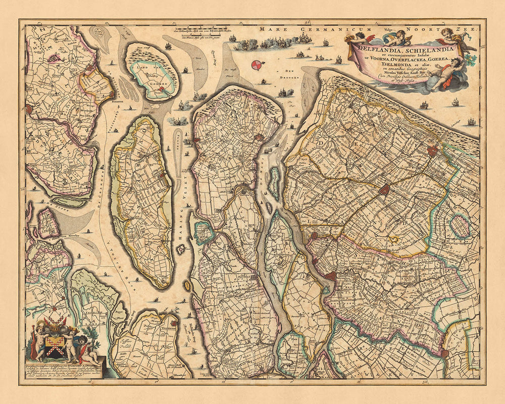Mapa antiguo de Delfland y Schieland por Visscher, 1690: La Haya, Rotterdam, Delft, Hellevoetsluis, Ridderkerk