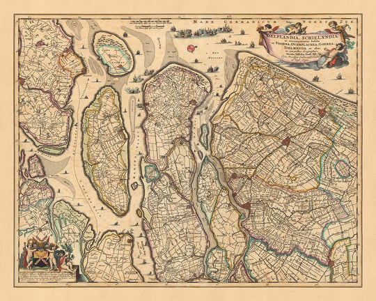 Esta notable pieza de la historia es un antiguo mapa de Delfland y Schieland, meticulosamente elaborado por Nicolaes Visscher II en 1690. Como parte de la Edad de Oro holandesa, los mapas de Visscher eran famosos por su precisión y atención al detalle, y este mapa no es una excepción. El nombre completo del mapa, 'Delflandia, Schielandia et circumjacentes insulae ut Voorna, Overflackae, Goerae, Yselmonda et aliae', se traduce como 'Delfland, Schieland y las islas circundantes como Voorne, Overflakkee, Goeree, IJsselmonde y otras'. Esto proporciona una indicación clara de las regiones y divisiones políticas que cubre el mapa, que es principalmente el área actual de los Países Bajos.