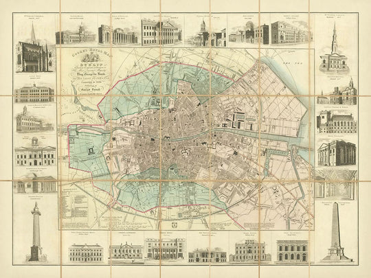 Los barrios de Dublín cobran vida en este mapa, con zonas como Merrion Square y St. Stephen's Green que ofrecen una visión de los elegantes barrios residenciales de la ciudad. La representación detallada de calles como O'Connell Street y Grafton Street refleja la condición de Dublín como un próspero centro urbano. El meticuloso diseño del mapa permite a los espectadores explorar la intrincada red de calles y plazas de la ciudad, lo que proporciona una visión fascinante de la vida cotidiana de sus habitantes a principios del siglo XIX.
