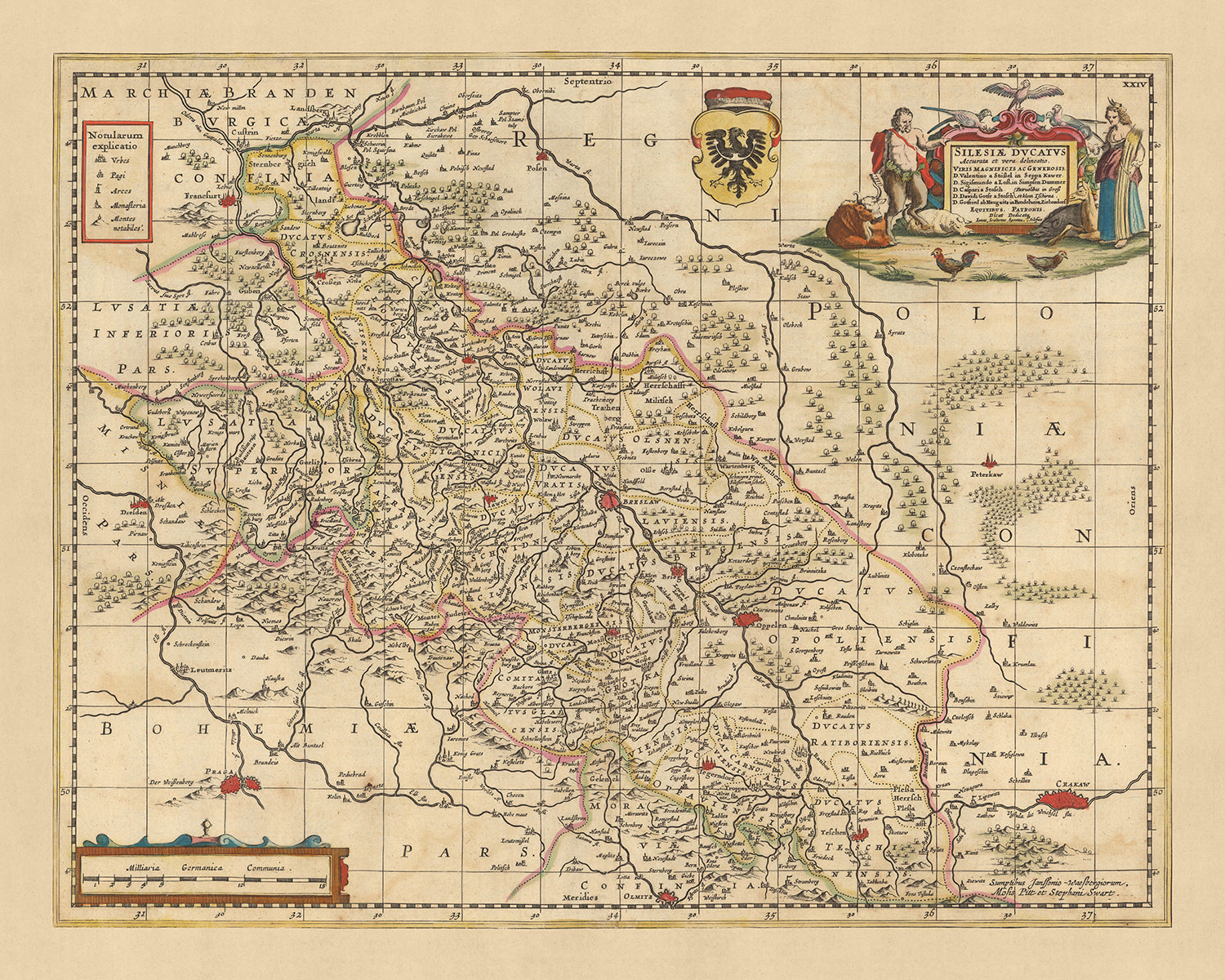 El mapa muestra varias ciudades importantes, cada una con su propia historia y significado histórico. Wroclaw, conocida como Breslau en alemán, fue la capital histórica de Silesia y está bellamente representada. Praga, la capital del Reino de Bohemia, es otra ciudad notable que aparece en el mapa. Es fascinante observar estas ciudades tal como se percibían en el siglo XVII, lo que proporciona una lente histórica a través de la cual ver su evolución.