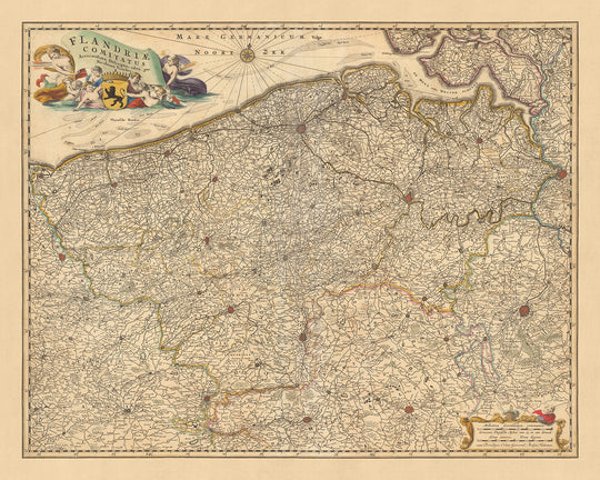 Retroceda en el tiempo con este mapa meticulosamente detallado de Flandes, elaborado por el renombrado cartógrafo Nicolaes Visscher II en 1690. Este mapa, originalmente titulado 'Flandriae Comitatus: Accuratissima Descriptio edita', o 'La descripción más precisa del condado de Flandes', ofrece un rico tapiz del paisaje histórico y geográfico de lo que hoy es una parte importante de Bélgica.